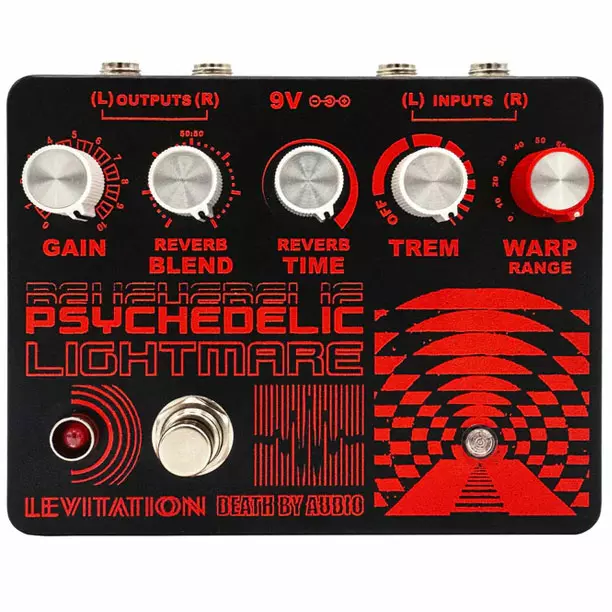 Developed through a collaboration between Levitation Festival and Death By Audio, the Psychedelic Lightmare combines stereo reverb, tremolo, and light-sensitive pitch modulation in a single effects unit. The pedal’s defining feature is its optical sensor, which dynamically alters effect parameters based on ambient light levels.