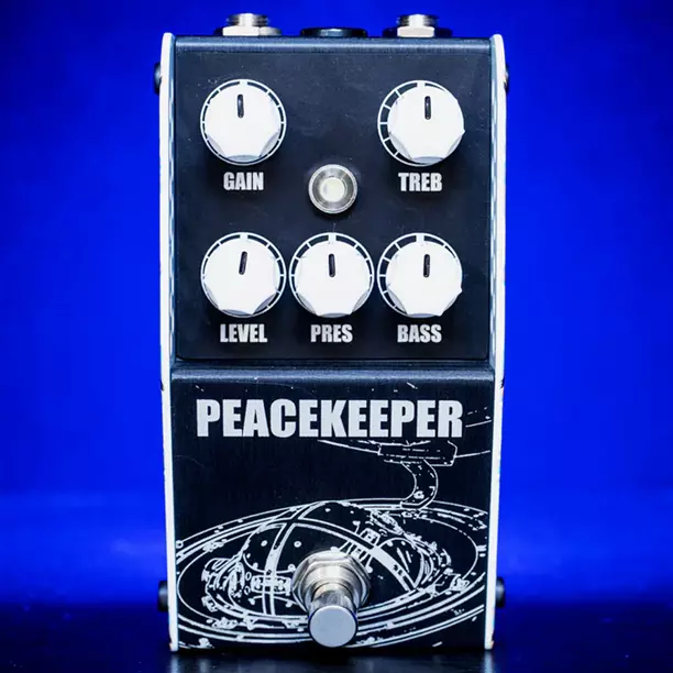 The Peacekeeper is a versatile overdrive pedal featuring a post-gain active Treble and Bass circuit, paired with a pre-gain Mids/Presence control for precise tonal shaping.