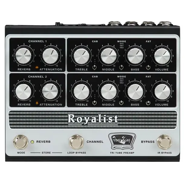 The Royalist features two independent channels, each with Volume, Bass, Middle, Treble, and Reverb controls. The defining feature is the three-way voicing switch per channel, tracing the evolution of British amp tone: